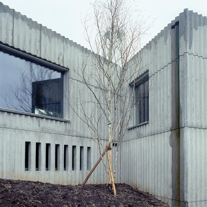 The owners of a 1920s mansion needed a more convenient access to their vast garden. Instead of reaching directly into greenery, the new access opens onto a garden room, defined by folded waved concrete walls. Its minimal interface allows the volume to develop as far as possible into the garden: it’s all about living in nature, a classical modern topic inspired by the traditional elements found on the site.