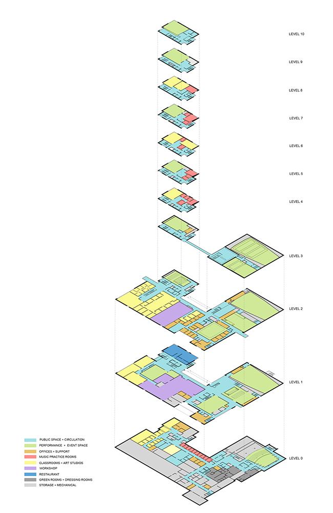 So there were both simplifications of form and material changes that happened as the design progressed. But our concept throughout was to create a tower of the arts with different disciplines of the visual and performing arts in a vertical building connected by stairs that were beautiful, varied, and fun to use. We wanted to replicate a situation similar to Carnegie Hall where we have lived and worked surrounded by studios of musicians, dance teachers, photographers, artists and architects.