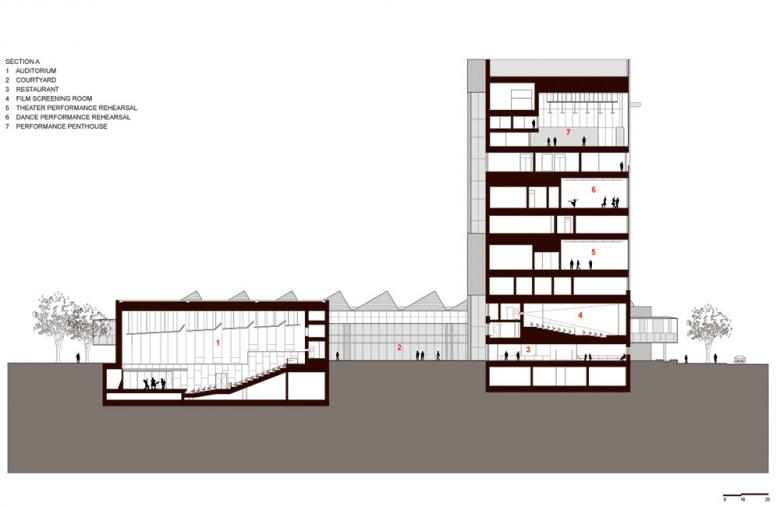 We had envisioned a 12-story tower connected to a horizontal building housing three professionally-equipped theaters and arts studios under saw-toothed skylights.  All the entries were estimated to establish that they were on budget. While each submission passed, as you can imagine, they were wildly different. After the design review, costing phase and architect interviews, the selection committee evaluated previous built work along with former client interviews. We were selected as architects in June 2007.