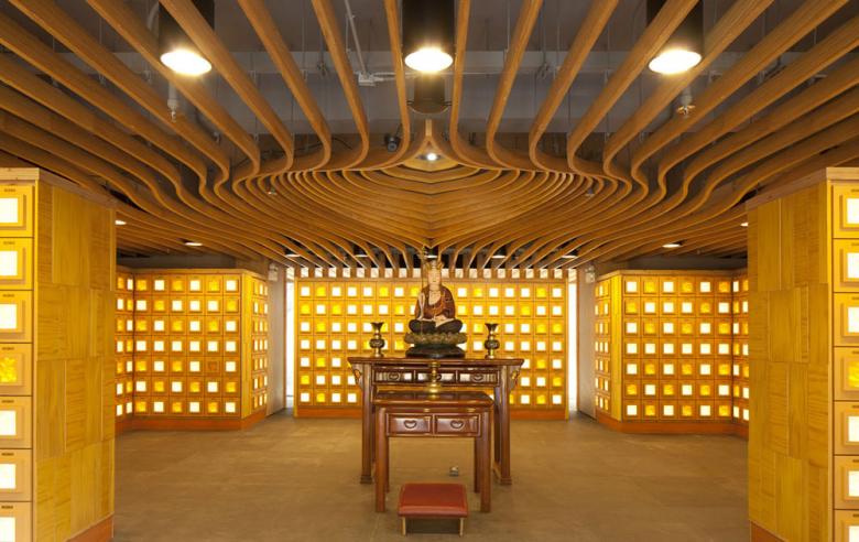 This example illustrates that religious buildings today need a new and radical strategy to attract people and to express the power of Buddhism. In a world of simultaneous action and endless attractions it is important to offer concentrated spaces that opens up a spiritual space beyond the everyday and the anxieties of a globalized world. Eureka’s work, which is on-going for the other buildings in the park, transforms the existing buildings into a sanctuary with a contemporary image.