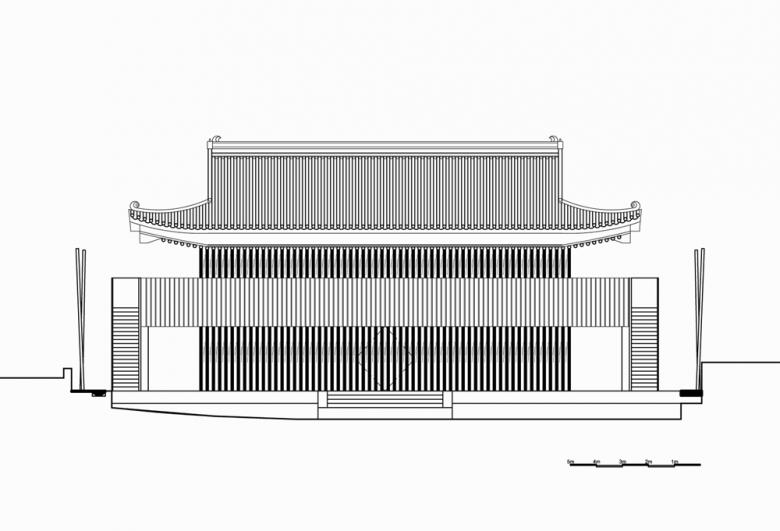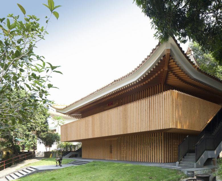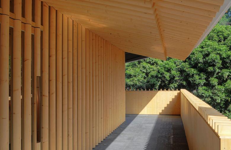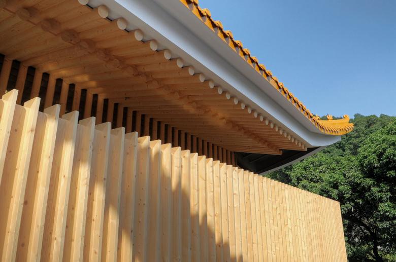 The ancestor memorial hall, which has now been renovated by Eureka, originally consisted of a two-storey building made of reinforced concrete with a huge balcony around the first floor. The balcony is reached by two flights of stairs, left and right of the symmetrical front. The hall with its big golden tiled roof was rather simple, and without any spatial or aesthetic refinement. For the overall development of the park and its buildings, a subtle strategy was chosen to highlight the important public venues. In the case of the memorial hall, the fussy skin of the building was unified with simple vertical pine slats alternating with glass bands, which clarifies the volume of the building. This architectonic gesture gives footing to the memorial hall within the natural environment.