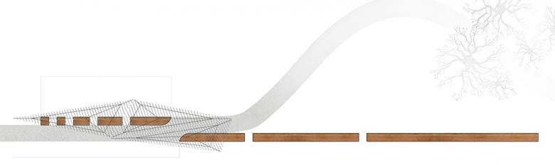 The wall is punctuated in a Fibonacci sequence to frame views, open passages through the wall, and recall the presence of nature. The charred cedar and steel canopy was designed to extend the dappled light and shadow of the adjacent woodland canopy. The charring of the louvers - in the shou-sugi-ban technique - serves to protect the wood and recalls the annual burning of the tallgrass prairie from which the trailhead emerges. Ultimately, design decisions were shaped by a desire to create a rich sensory experience and intensify the presence of the place.