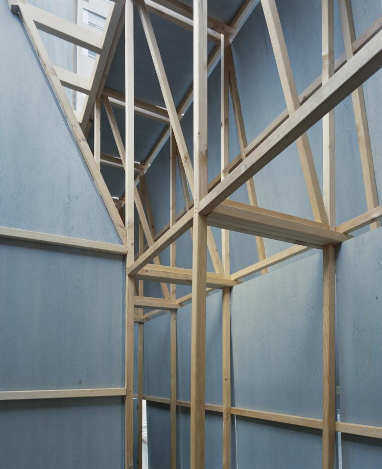 The high walls of the bathing facility are made of a regular timber structure clad with uncut wooden panels temporarily used for the installation. If the panels will find a second life after the festival, the fountain itself will go back to its uselessness, leaving behind only memories and new vision of what public space could be.