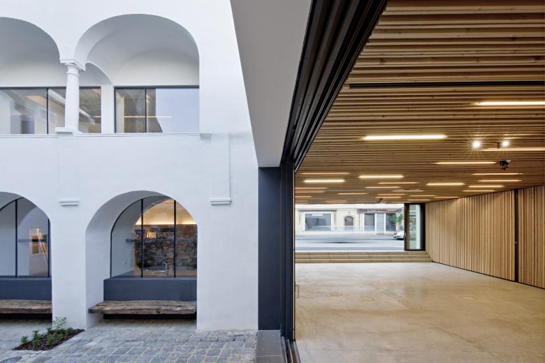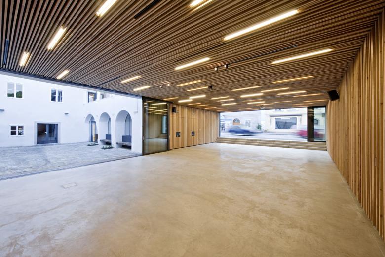 SUE Architekten have transformed a dilapidated corner building on the market square in Ottensheim into an open local authority building in which old and new form a perfect symbiosis. The beauty of the historic vaulting, frescoes, wood ceilings and inlays in the renovated existing building has been fully revealed. The extension with the transparent, council meeting hall (which can be opened completely) makes the move into the street space in a masterly fashion. It extends to the arcade in the courtyard, so that the hall becomes a kind of through-building.
