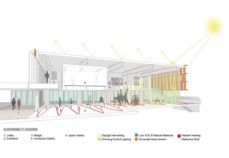 The terra cotta façade is a rain and solar screen which reduces heat gain on the envelope of the building. In addition, the screen shields direct sunlight from the art objects within. In order to develop this expressive ceramic façade, we worked with Boston Valley Terra Cotta and a standard tube and color palette.
