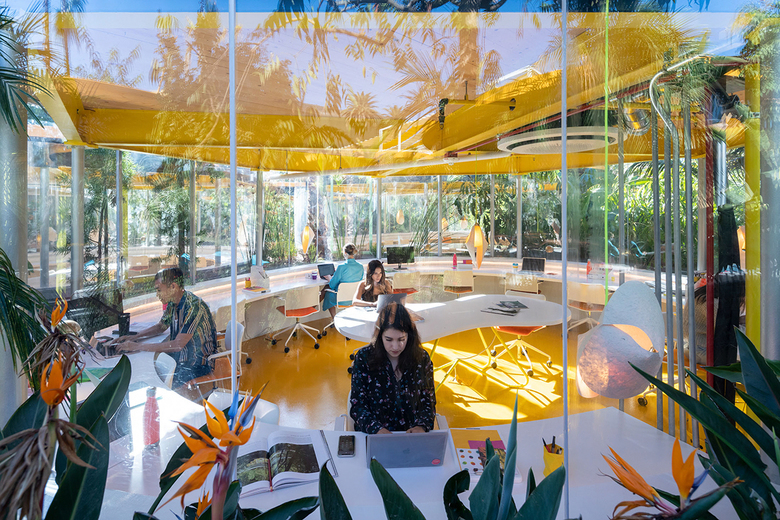 The interior spaces in this project go pretty much unnoticed and the main focus is outdoors, which is quintessential to the living style in Los Angeles. In Second Home Hollywood, instead of bringing the garden inside the office, we have brought the office out to the garden. Sixty one-level standalone offices in the garden of a Paul Williams building. Offices (pots) surrounded by planters (plant pots). Over 10,000 plants and trees, many butterflies, ants, bees, squirrels... and humans inhabit these pots. The wooden and concrete paths break through the garden with plants in both sides, as a stroll through yearlong flowers.