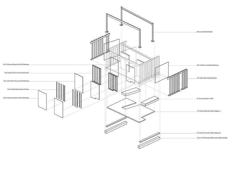 The project is constructed from 4 primary components, each in a distinct material: concrete plinth, carbon steel screens, wood roof panels and white laminated glass envelopes. Shop drawings for all members of each component were extracted from a computer model, facilitating precise and efficient off-site prefabrication.