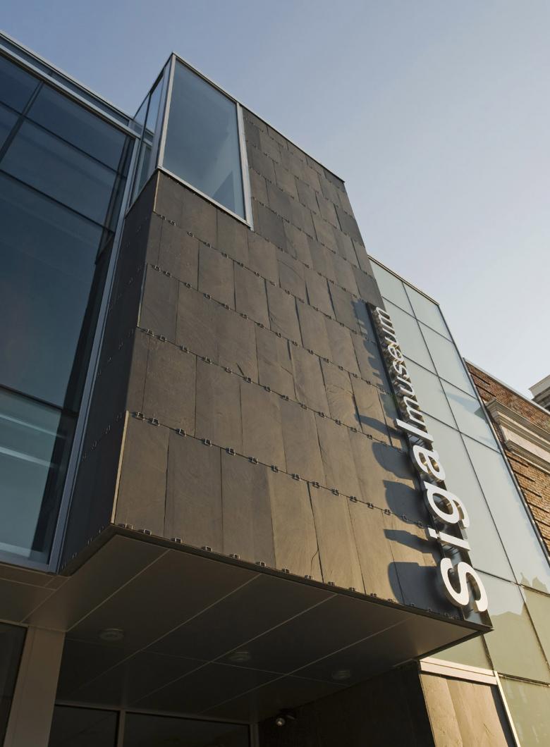 The Sigal Museum’s identifying signage is incorporated into the façade, which features a rainscreen of locally quarried slate.