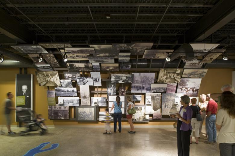 Museum visitors explore local history through the multi-dimensional interactive display wall.
