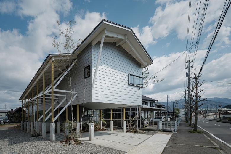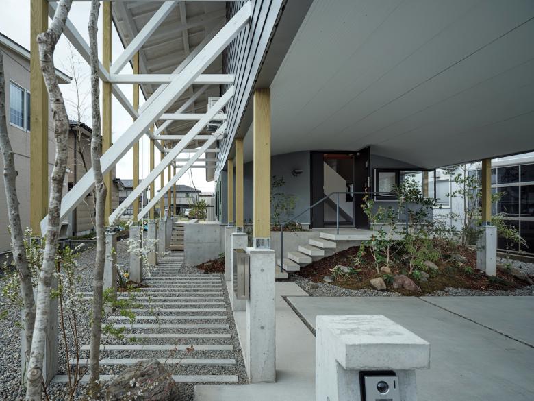 In the midst of humanity's current climate crisis, we feel it is important to explore ways of life that are deeply rooted in the local climate. This residence located in a cold region with heavy snow was designed to suit the busy lifestyle of a family with young children and one parent who works in the medical field. The lot sits in the Fukui Plain, which suffered urban flooding of its rivers in 2004, and is in a designated flood zone extremely close to the Kuzuryu River. Fukui Prefecture also experienced record-breaking heavy rain two years ago. Because the client needs to commute to the hospital during emergencies, they chose the property based on snow removal from surrounding roads in winter. In line with the client's personality, we focused on ensuring the residence is resilient in the face of public health and climate threats.