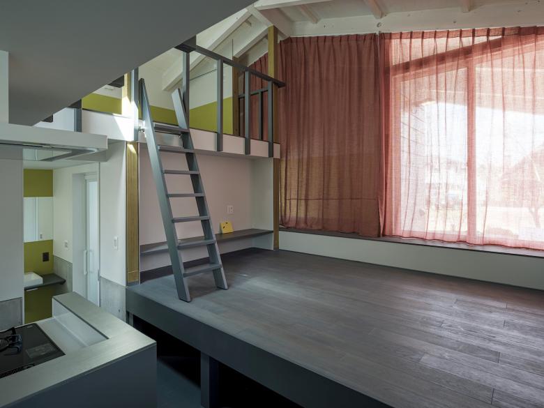 To avoid damage from floodwater or snow, our first step was to raise the foundation 1.2 meters above ground level. Mounded earth around the building keeps snow away from the building, and this undulating landscape is planted with native trees and edible plants. A fulfilling daily life thus coexists with an environment designed to be resilient during disasters. Inside, a gable roof covers a single interconnected space with varying floor levels. A diffuser connects the two skylights, distributing natural light through the interior despite the relatively small number of windows. The exterior columns, landscaping, and nearby vegetation provide keynote colors for the indoor space, bringing color to the residents' lives in winter and directing their thoughts to the outside world and nature.