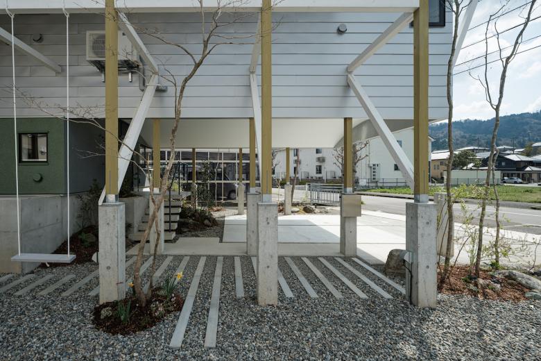 In Fukui, where rain is frequent, roofed outdoor spaces inevitably become places for spending time with friends, playing, drying clothes, parking bikes, and storing tools or trash cans. (Photo: hideki ookura)