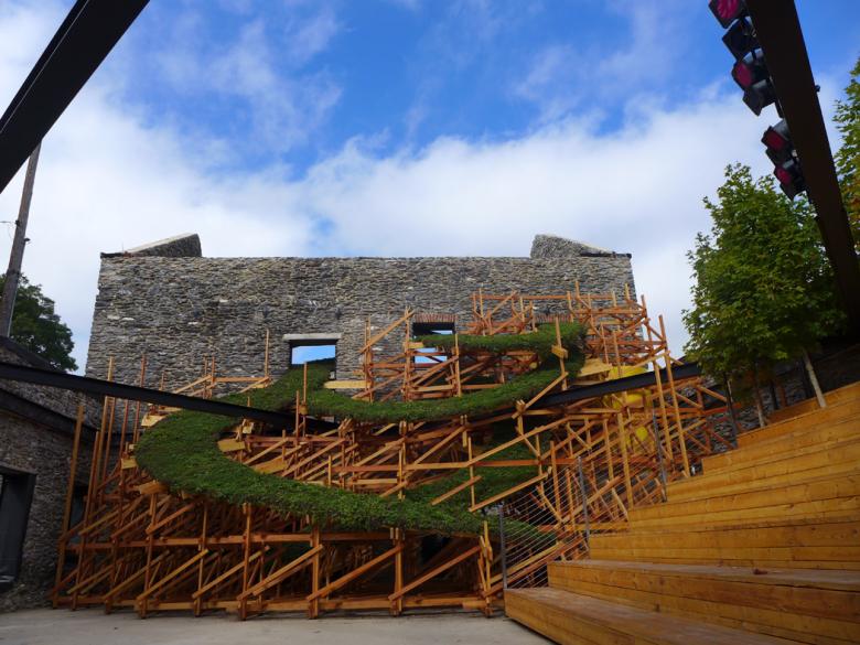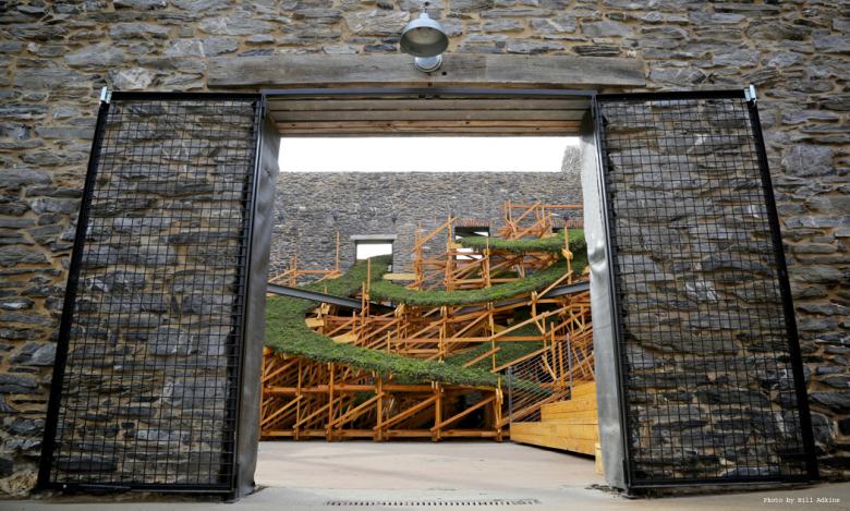 As an artist, my artwork typically explores the opposite of how this building came to be. In my sculpture, I generally dissect contemporary American culture and our tendency to over-consume, over-build, over-groom, etc. in lieu of direct physical exertion to ensure survival.  Today our actions are a grossly amplified, because one gallon of gasoline equals five hundred hours of human work output. Within this culture, we have created an industrially generated vernacular, whose regularity can create the uncomfortable experience of an uncanny valley, a stark contrast to this pre-industrial building shell. It is with this eye that I approached the design for Sky Stage.