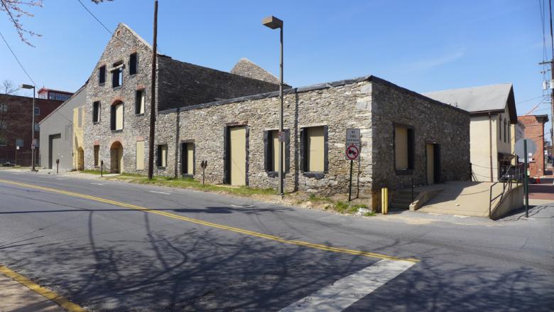 This building was constructed by hand before the American Revolution. The stone was quarried from the property. In the alley adjacent to the building, the quarry’s original stone vein is still visible. Much of the beauty of the remaining building shell comes from the stonework and its irregularity and the building’s decay.