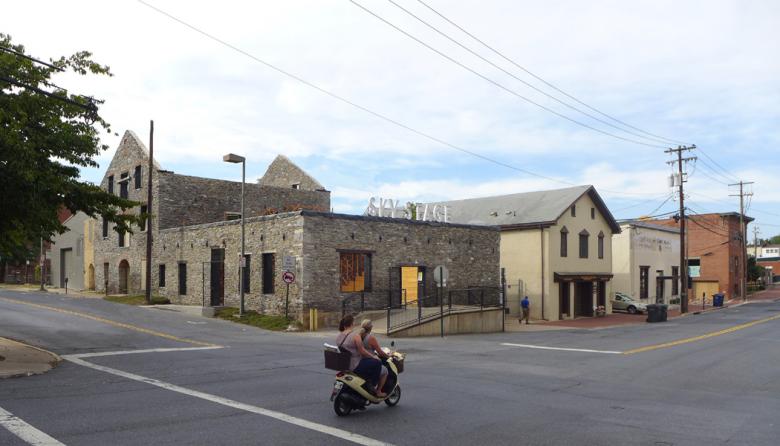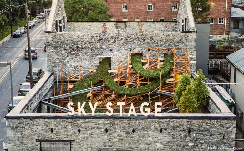 Sky Stage temporarily transforms a boarded property in Frederick, Maryland’s downtown historic district into an interactive building-scale public art work.