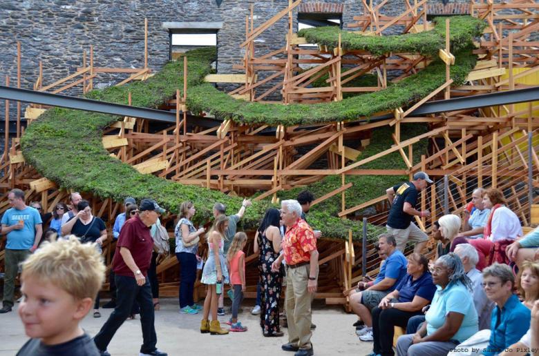 I then chose to further celebrate the handmade, by making Sky Stage a place where the public is invited to create, rather than just consume. The sculpture grows into bleacher seating for an audience of 140. The Frederick Arts Council and AmeriCorps are working with neighbors and the community to help them organize their own performances, readings, pop-up art shows, and other creative endeavors in the space.