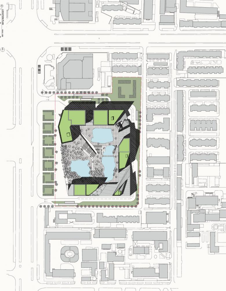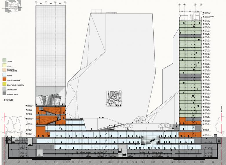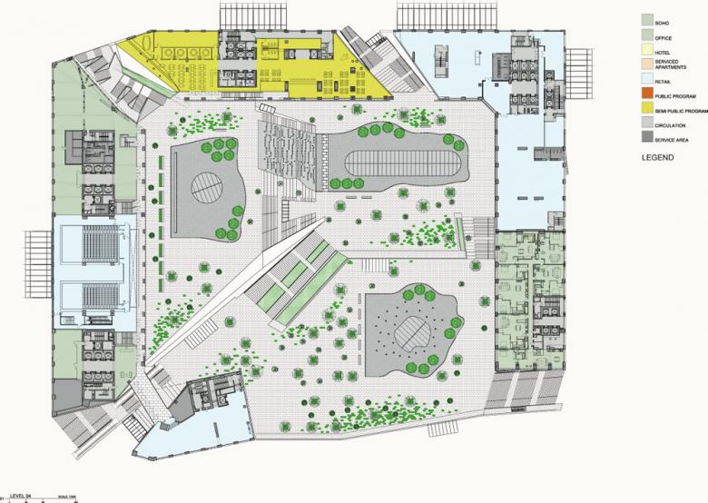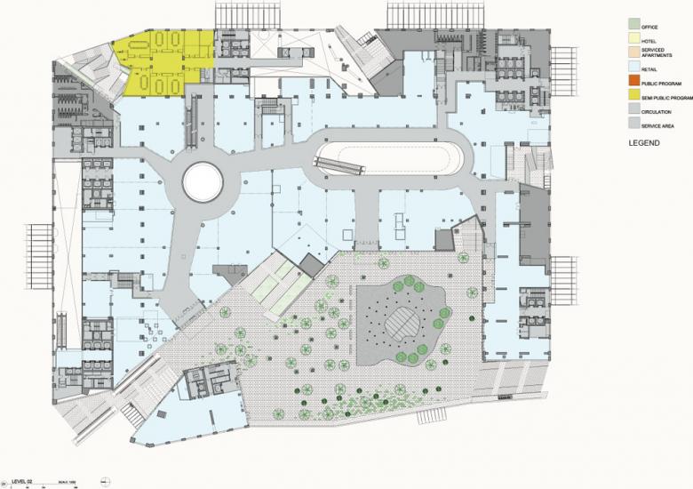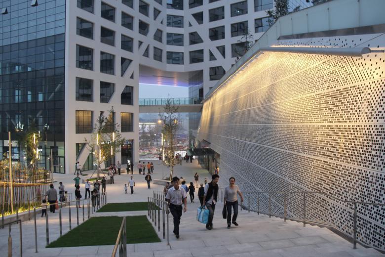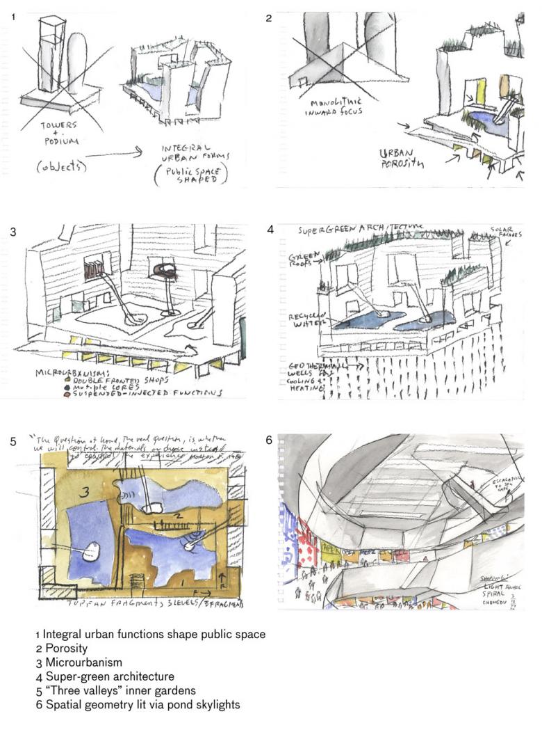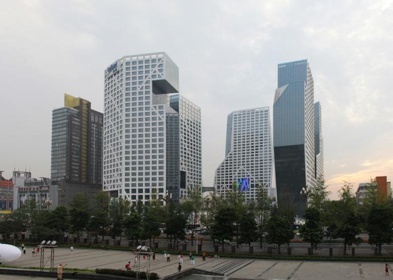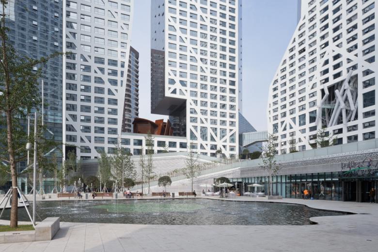 The design for the Sliced Porosity Block was inspired by the city's greatest poet, Du Fu (713-770), who wrote, 'From the northeast storm-tossed to the southwest, time is left stranded in Three Valleys'. The large public space in the centre therefore forms “three valleys”, surrounded by five high-rise towers on a podium with an overall space of more than 300,000 square metres. The aspect of time mentioned in the poem is reflected with water gardens on the plaza levels, which show three different temporal aspects in the form of a Fountain of the Chinese Calendar Year, a Fountain of the Twelve Months and a Fountain of Thirty Days. All three fountains function as skylights to the six-storey shopping precinct below. The architects placed small-scale double-fronted shops to the street and in the shopping centre, in order to establish a human scale and activate street life following the concept of “micro-urbanism”.