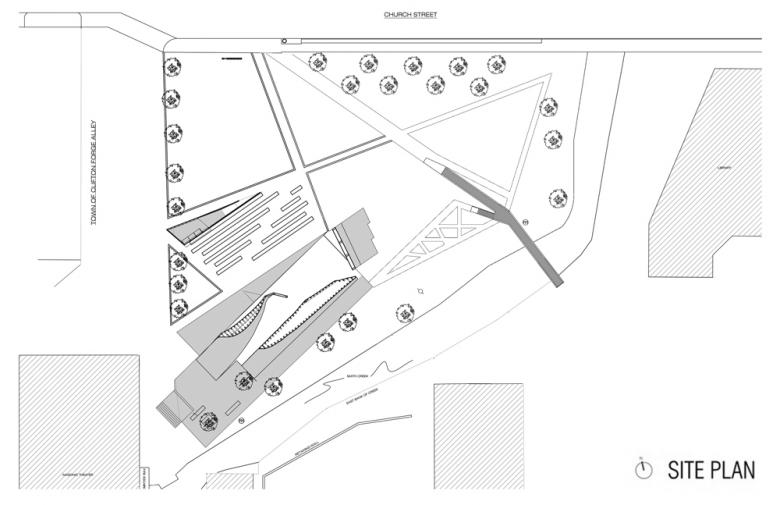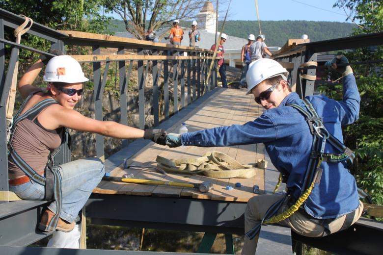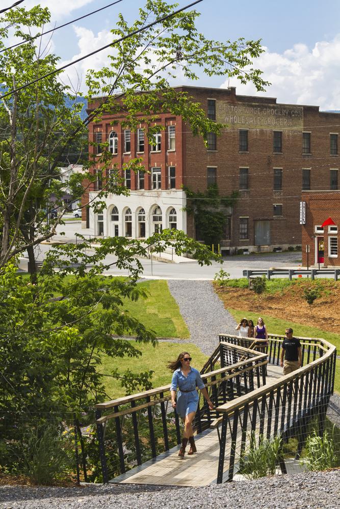 The Smith Creek Pedestrian Bridge project was the second phase redevelopment of a post-industrial brownfield into a public park and performance space. Phase one was initiated after a group of design/buildLAB students completed an urban study of Clifton Forge, VA. The study identified the concurrent needs to both remove industrial production and to create public space at the center of town. A combination of local volunteers, government leaders and a philanthropic foundation were able to arrange a land swap to move a tire retreading facility to an industrial park and to make its land available for a civic infrastructure project. The LAB then led a campaign to marshal the donated professional services, the discounted materials, and the grant funds needed for the park and amphitheatre. Phase one (the Amphitheatre) was funded, designed and built in 2011-2012 and phase two (the Bridge) was funded, designed and built by a our subsequent group of students in 2012-2013.