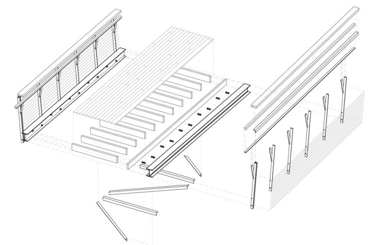 This project is the collaboration of seventeen third-year undergraduate architecture students. Our design process began with the research of precedents, the documentation of relevant codes and regulations and with interviews of community members. Initially we created individual designs. Slowly, these designs were merged on the basis of similar ideas, materiality, and construction, culminating in one schematic design. We then broke into three groups: Ramp/Stair, Hub, and Bridge/Span. Within these groups of approximately five students we developed and detailed our respective portions. Our groups met regularly to ensure continuity.
