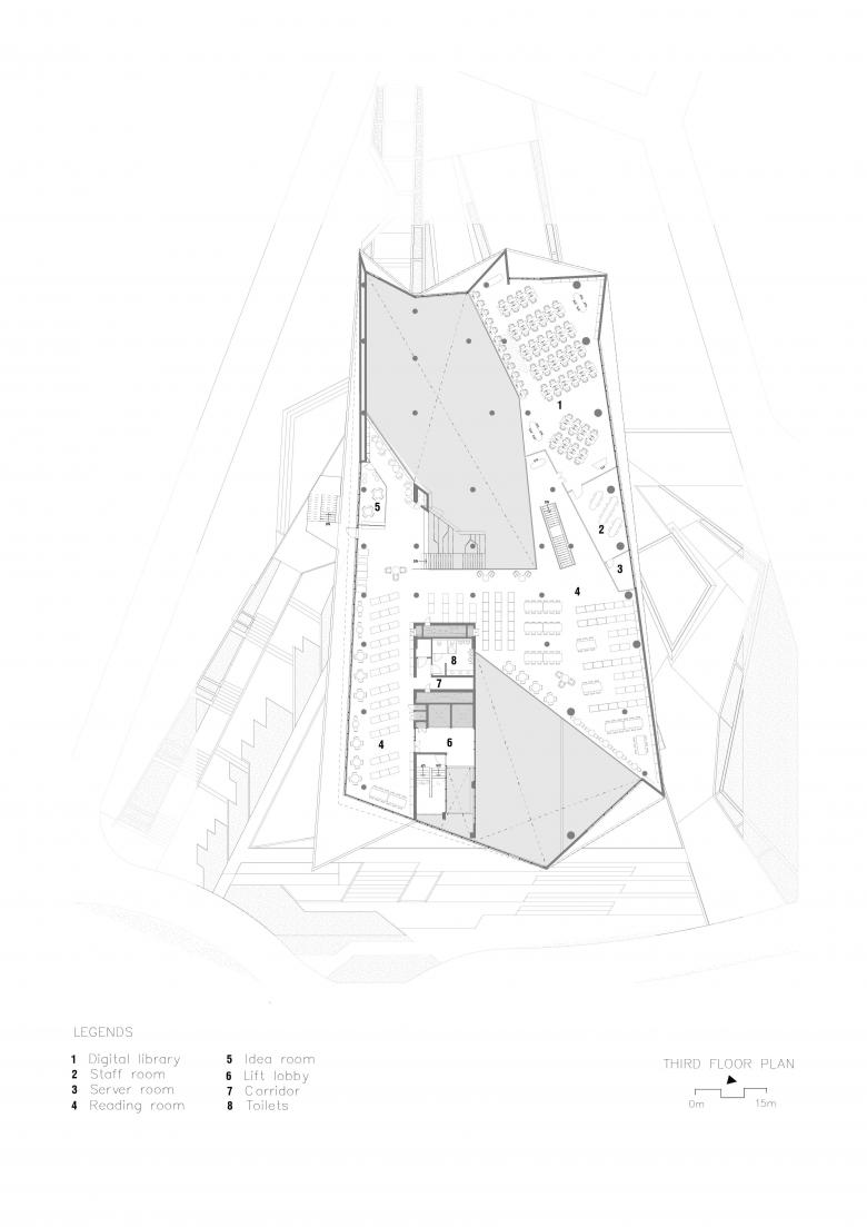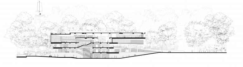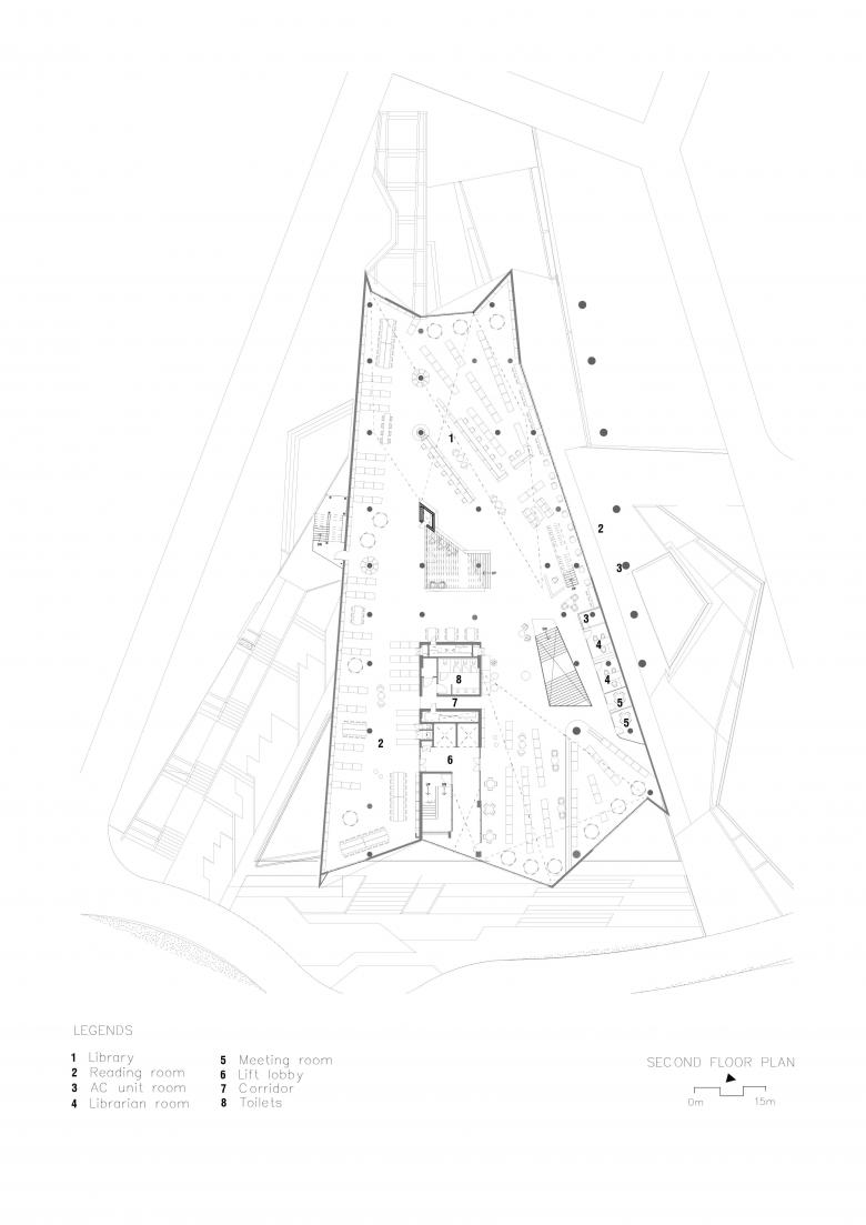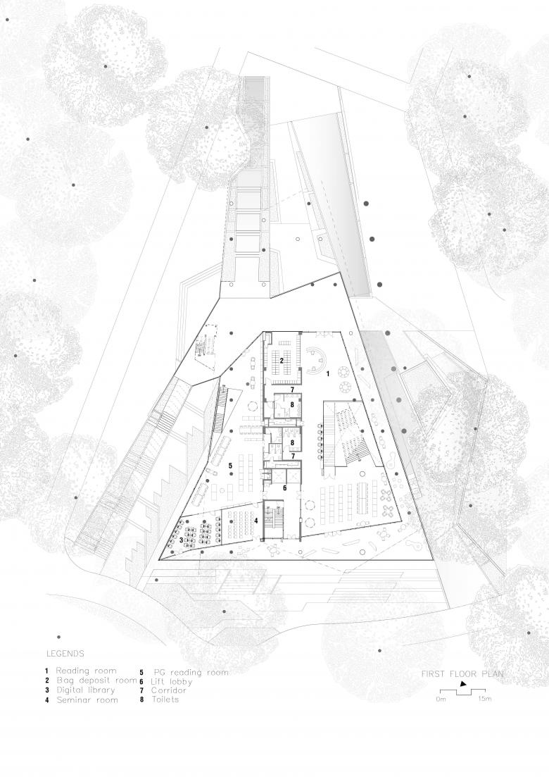 The project is unique in the way it refuses the “iconic object” stance and instead democratizes space through porosity and ground-forming. It merges with the terrain, bends around existing trees, and allows pedestrian paths to traverse the volume, so the building functions as campus infrastructure as much as a library. Its sectional variety—from intimate nooks to generous commons—delivers multiple scales of occupation without imposing hierarchy. The result is an institution that is simultaneously rooted, welcoming, and continuously engaged with the life of the campus.