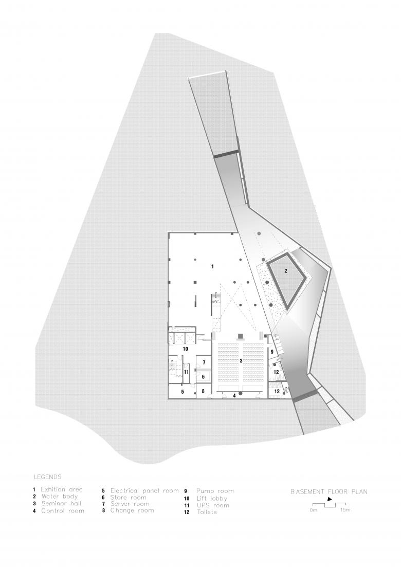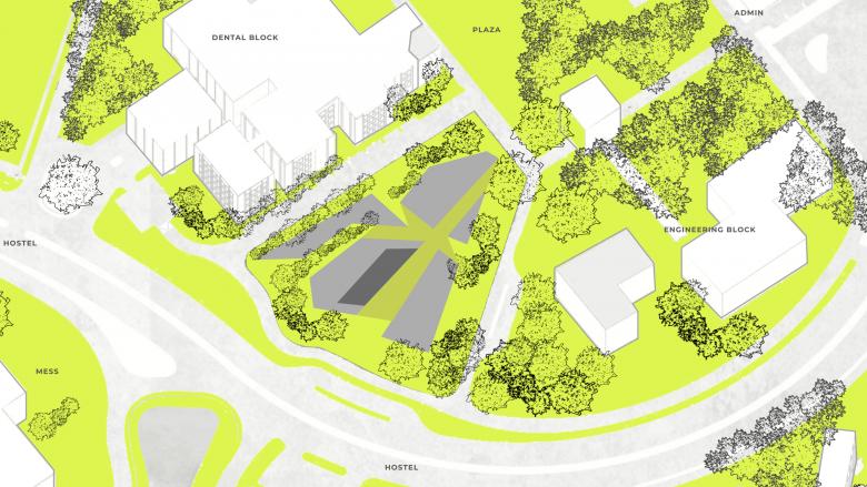 Site forces were decisive: an arterial road bisecting hostels and academics, the adjacency to the planned central plaza, and a significant tree cover. The building negotiates these conditions by folding into the ground, threading between trees, and admitting pedestrian desire lines through its body. Its edges open to the plaza to act as a spillover civic room, while its massing anchors key crossings to calm and organize movement. In short, the site’s flows and ecologies authored the form.