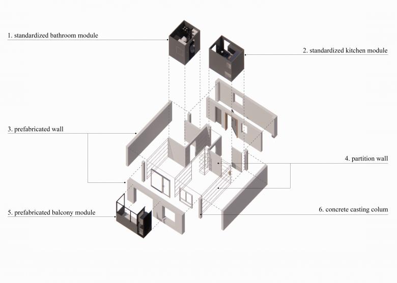 The 4,000 housing units comprise six general types, and four ultra-low energy consumption types. The size of the units ranges from 40 to 60 square metres. Coated panels are used as partition walls between the rooms, allowing for easy maintenance and flexible design by the residents.