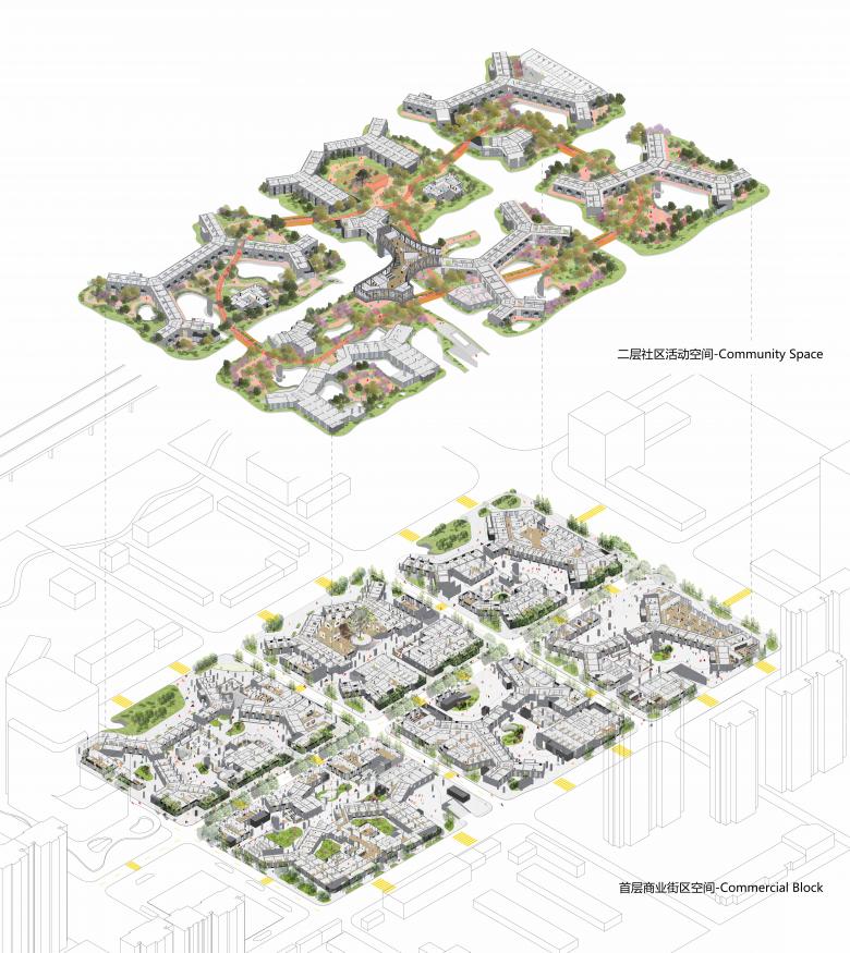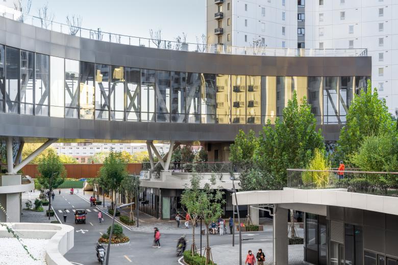 MAD Architects designed a building complex composed of six blocks that form a spatial unit with staggered heights and different orientations. A central avenue connects the blocks at street level with spaces provided along its length for facilities for daily needs, including shops, cafés, restaurants, kindergartens, pharmacies, bookshops and elderly care facilities. Locating these service offerings on the ‘messy’ ground floor level guarantees a lively as well as spatially and socially integrated neighbourhood, that refers to a traditional urban quarter.