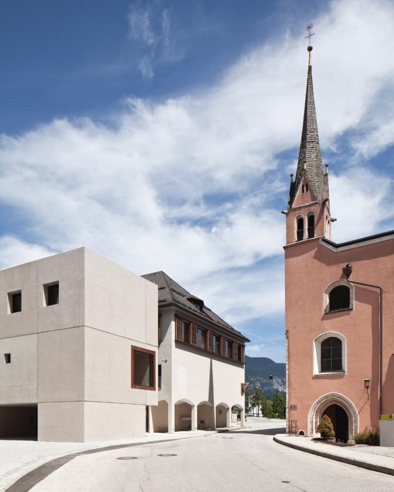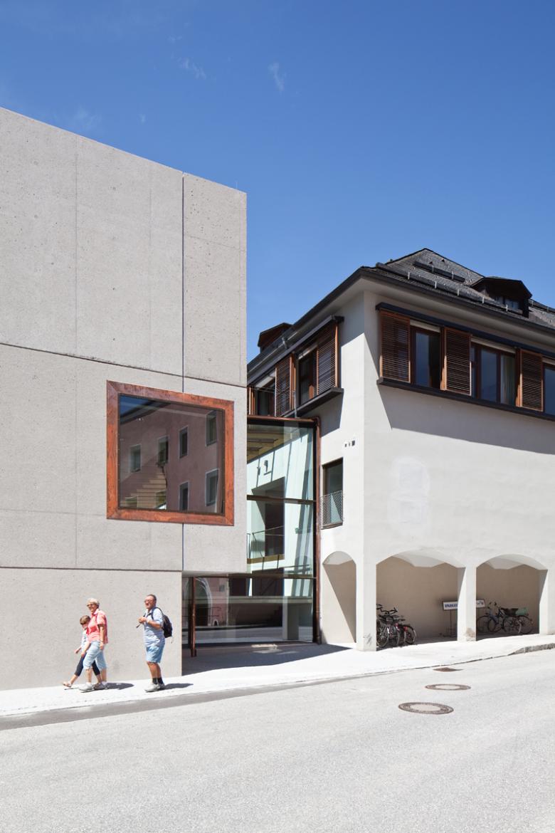Daniel Fügenschuhs Projekt durchzusetzen, war aber alles andere als einfach. Obwohl der Architekt, der nach Praxisjahren in den Ateliers von West 8 in Rotterdam und Michael Hopkins & Partner in London seit 2004 in Innsbruck sein eigenes Büro betreibt, den vor rund einem Jahr von der Dorferneuerung des Landes Tirol ausgeschriebenen – geladenen – Wettbewerb für den Schulerweiterungsbau eindeutig gewonnen hat. Zu dem er neben größtenteils sehr lokalen Größen auf Vorschlag der Architektenkammer geladen worden war. Aber da der Bauplatz in der geschützten Altstadt gelegen ist, hatte der dem Tiroler Stadt- und Ortsbildschutz-Gesetz (SOG) verpflichtete Beirat hier ein gewichtiges Wörtchen mitzureden. Und so manchem Beirats-Mitglied war Fügenschuhs minimalistischer Entwurf zu extravagant, zu wenig angepasst, alles in allem zu betoniert. Durchgesetzt wurde das Projekt schließlich nicht unwesentlich durch die massive Unterstützung des beamteten Denkmalschützers Walter Hauser, der sich hier einmal mehr als kämpferischer Anwalt für eine ehrliche Baukultur in die Schlacht geworfen hat.