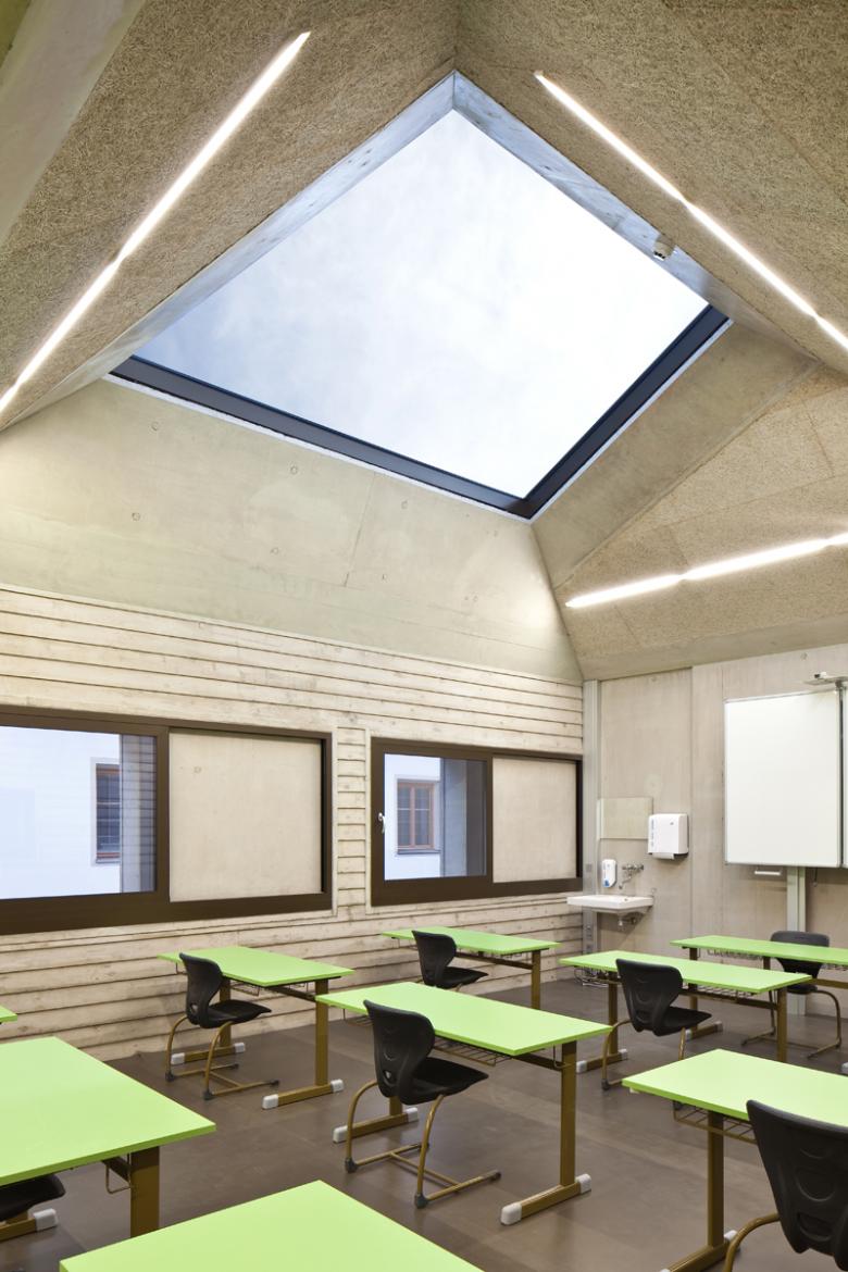 Der Bauplatz für den neuen Schulbau ist delikat. Er liegt zwischen dem aus der Gotik stammenden, im 17. Jahrhundert prächtig barockisierten ehemaligen Augustinerkloster – in dem seit den 1970er-Jahren nicht nur ein Museum für sakrale Kunst, sondern auch die Hauptschule untergebracht ist – und einem rund 40 Jahre alten Turnsaal. Der neue schlanke, bis zur Straße vorgezogene Baukörper ist an seiner Schmalseite in fast rechtem Winkel mit dem Klostergebäude durch kleine Brücken verbunden, während er rechtsseitig an den Turnsaal mit einer fragilen Glaskonstruktion andockt. Indem Fügenschuh das Haus im Erdgeschoß aufständert, ist außerdem ein neuer, teilweise überdachter, in seiner Pflasterung höchst urbaner kleiner Platz bzw. Schulhof entstanden. Er animiert zu vielseitiger Benutzung, ideal u.a. auch als Bühne für halböffentliche Veranstaltungen ist.