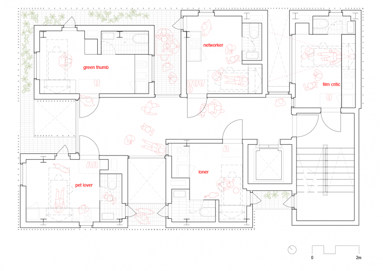 The project is a micro-housing building in Seoul, Korea that reflects our concept of "Micro-Urbanism." Instead of providing minimal subsistence living therefore, relationships between residents, art and retail spaces, and the urban community are formed to create a new kind of fine-grain urbanism. Occupying a small urban infill lot, fourteen units are carefully arranged to create a variety of public, semi-public, and semi-private, and private spaces that can be creatively occupied.