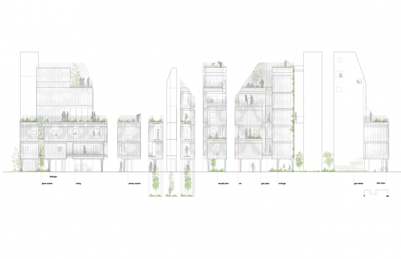 Unfolded elevation: A fine grain screen takes on the multi-purpose properties of the adhoc but highly functional additions seen on neighboring buildings. Depending on the location on the building it works as a railing, drainage path, privacy barrier, and bike rack while masking utilities such as conduits and gas lines.