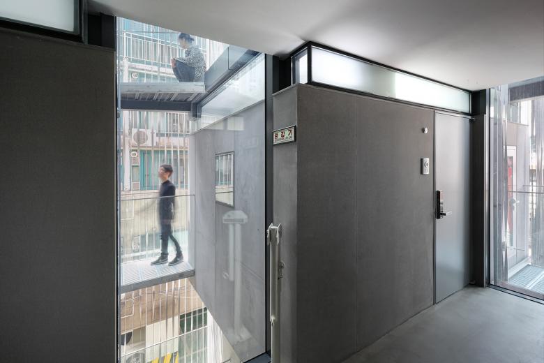 View of micro unit from light filled corridor