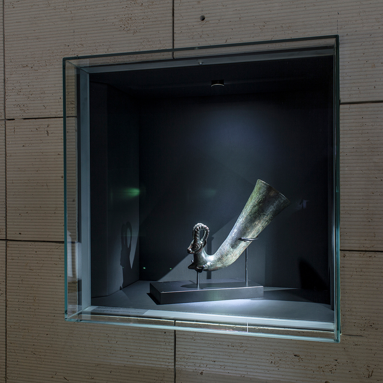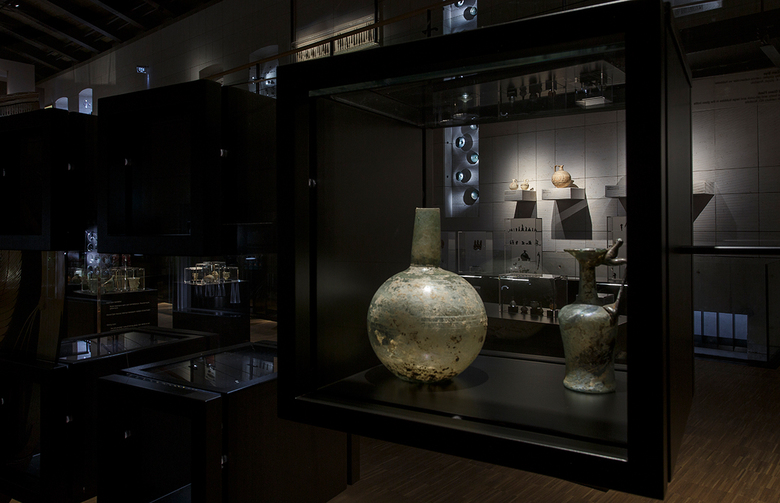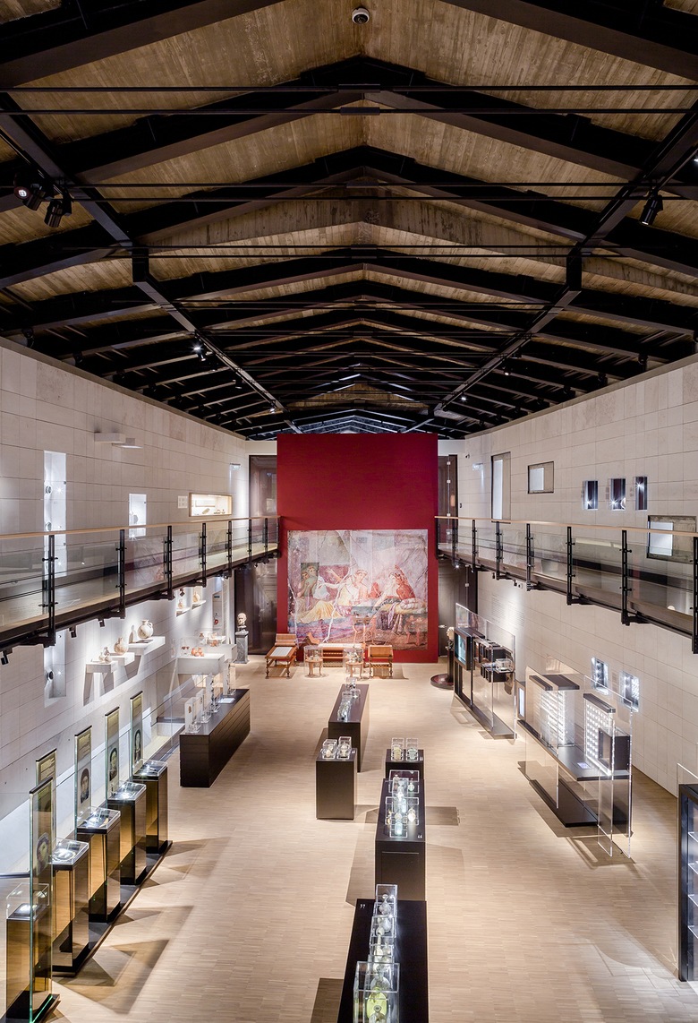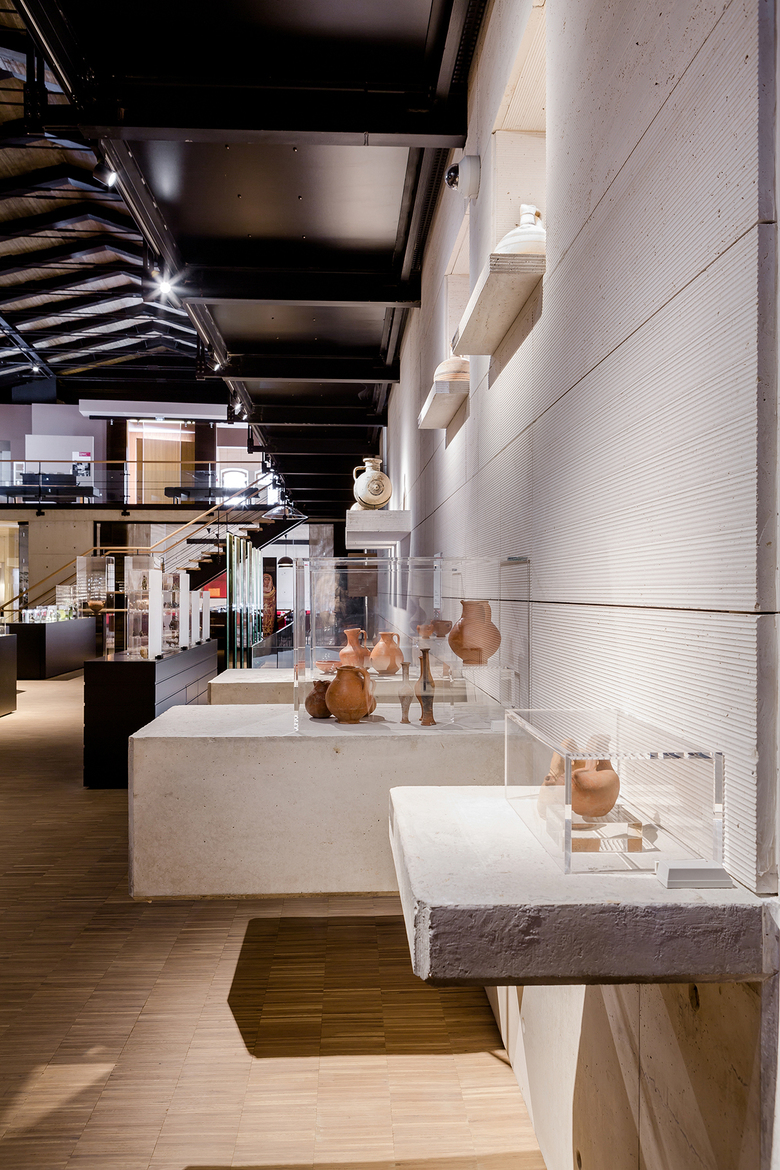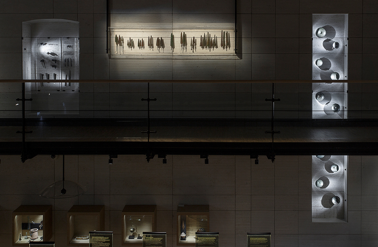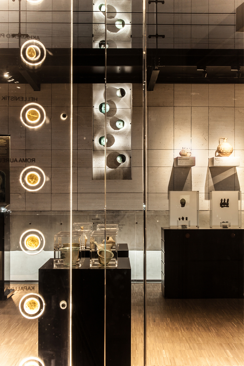 A vestibule on the mezzanine floor provides views of the custom-made display cases along two catwalks at the long western and eastern sides of the hall. Beautifully crafted stairs connect the permanent exhibition area below to this temporary exhibition floor. Carefully designed electric light illuminates the objects in front of a dark background. Counterintuitively, there is more light in the underground spaces. The concrete roof rests on steel beams and the thick walls are perforated only by display cases. While the black l-beams divide the museum into three units, the interior is still perceived as one space. The walls are slightly angled, creating a sublime sense of infinity learned from Baroque architecture to create an optical illusion diminishing towards the vanishing point.