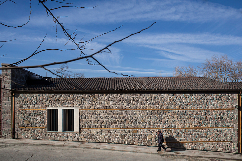 Contemporary l-beams were placed at the borderline where the houses meet the ground. Thus, the heavy load of the masonry walls is alleviated with a strong cut from the ground, and raised on a line, in order to reframe the houses and to be perceived as a single mass. A thin copper line on the exterior highlights the borders of the three houses, while the vertical water pipes together with the horizontal rooflines keep the houses together.