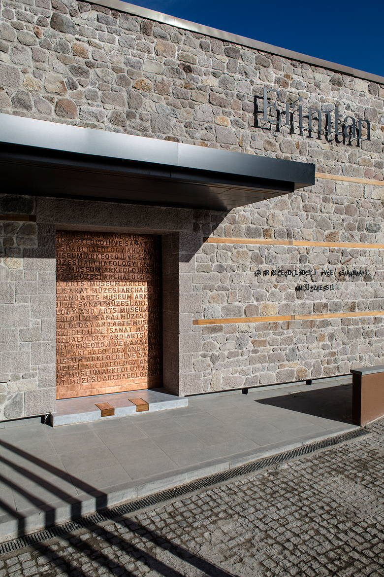 The entrance to the museum is emphasized by a beautifully detailed copper door and a wall of text relief. The low façades enhance the nearby citadel fortifications and form a continuous stone wall. Windows are interpreted as viewpoints and have arches formed out of cut stones and keystones. These reconstructed details were "treated as documents," according to the architects and resemble them in "scale, space, detail and material" — but with a twist. The openings mirror spolia from the Citadel fortifications that act as displays. The Citadel walls incorporate sculptures, capitals, stone ornaments, and pieces from antique columns. The spolia determine the depth of the walls and windows.