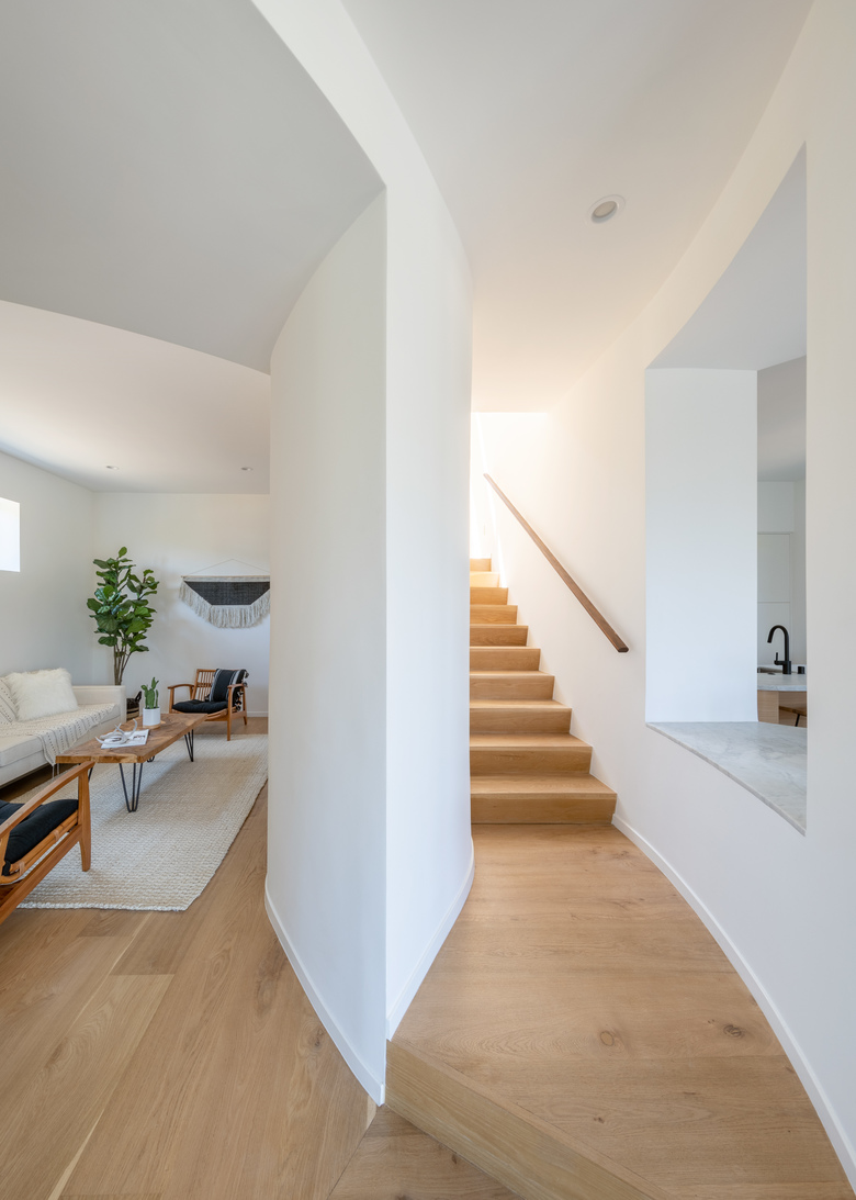 The primary living spaces at the third level (dining, kitchen, living, den) are organized into a simple grid of four rooms. The walls of each room curve at the center in a series of tangent arcs that blend the individual spaces while carefully opening views through the house. A central stair connects the living spaces to a rear dining patio and yard that overlook the house and mountains beyond. The upper fourth level features three bedrooms, with the master and en suite bathroom organized across the front of the house. A private two-car garage or workspace makes up the ground floor.