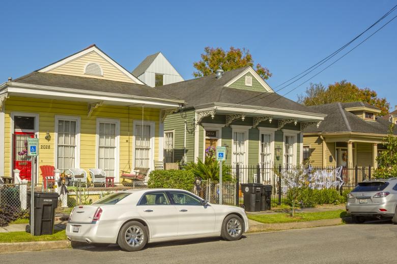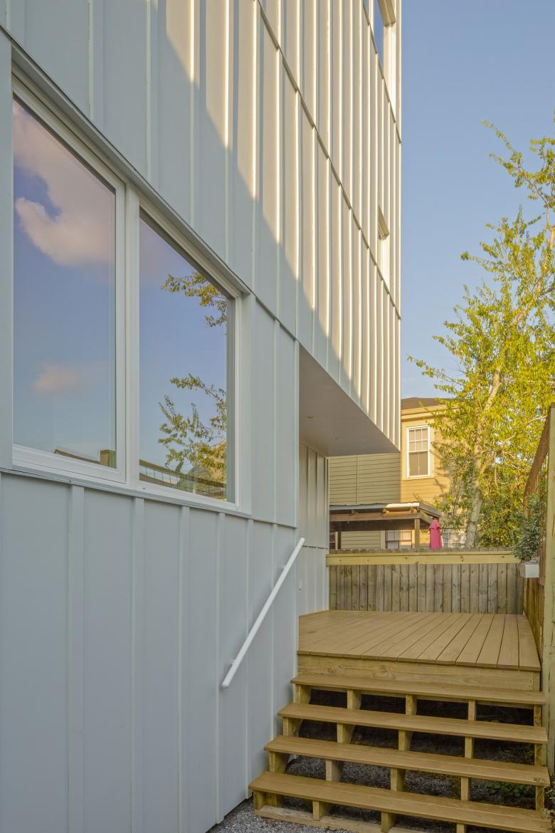 In keeping with the generalized precepts of speculative development, 4514 S. Saratoga is a standard three-bedroom, two-and-a-half-bath home. The limited site area — about a third the size of a traditional parcel in New Orleans — required the program to be stacked vertically and efficiently. An entry stoop was carved from the ground floor footprint and served to internally organize the main living spaces. A back porch and a small yard occupy the limited space required by setbacks.