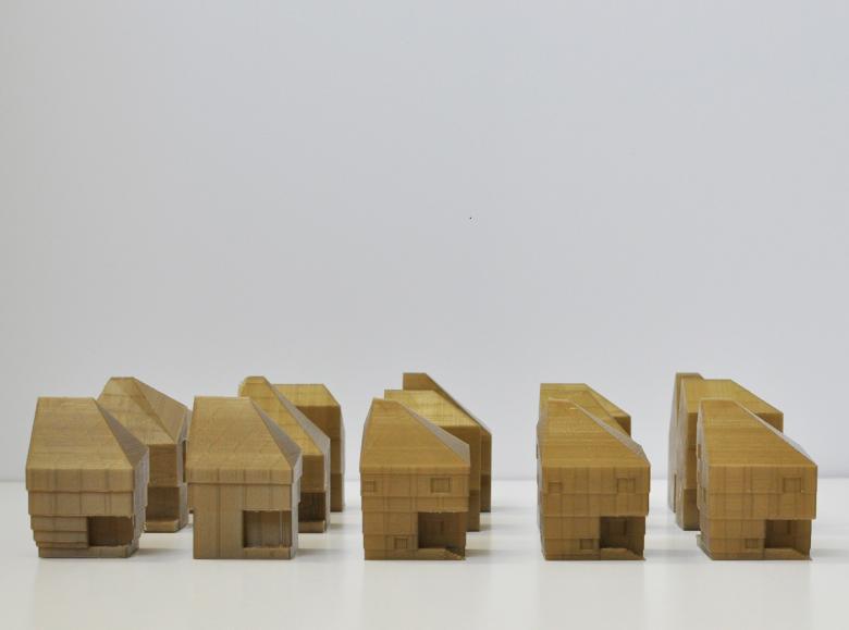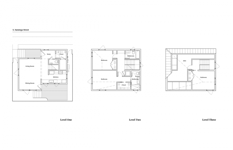 The overall form, ambiguously reminiscent of a traditional home, was devised to manipulate the perception of its true height and scale. The massing moves up and out, reflecting the open-space requirements of the first floor and the need to maximize permitted buildable area on the remaining floors. This is further reinforced with the detailing of the exterior cladding. Like other Starter Home* projects, 4514 S. Saratoga needed to utilize a ubiquitous and cheap material. In this case conventional cementitious panels were detailed to step out at controlled intervals to obscure the height of floor plates. Vertical batten strips, placed at varying widths, were misaligned to reinforce the stepped banding. From the street the upper floor is encapsulated in the volume of the roof, with the eve line no higher than a typical two-story home. The form opens up towards the rear and side to allow windows into the third-floor room. This peaked portion of the home, while not immediately present from its own street front, is seen along adjacent streets in an intentional interaction with the adjacent rooftop dormers, uncannily present though not entirely clear where it belongs.