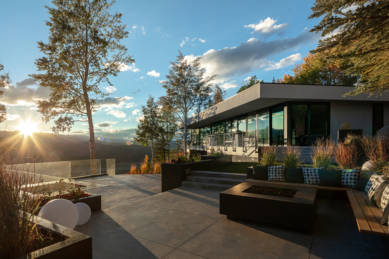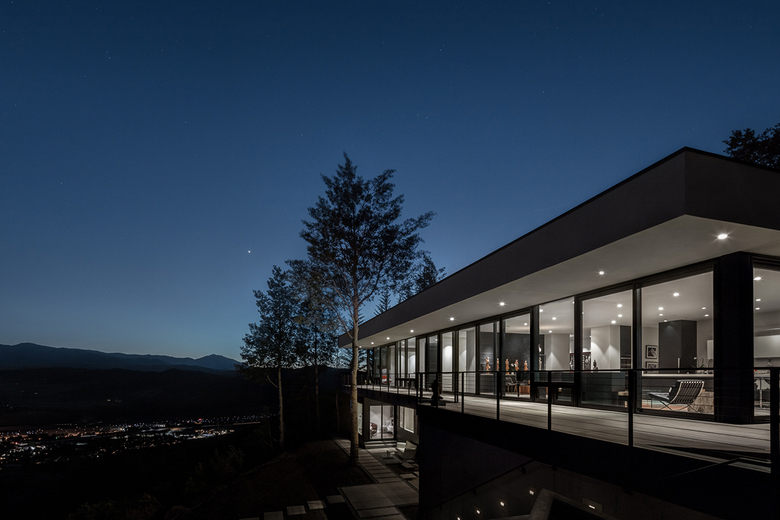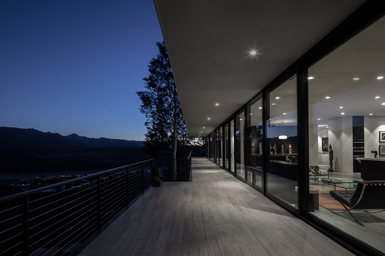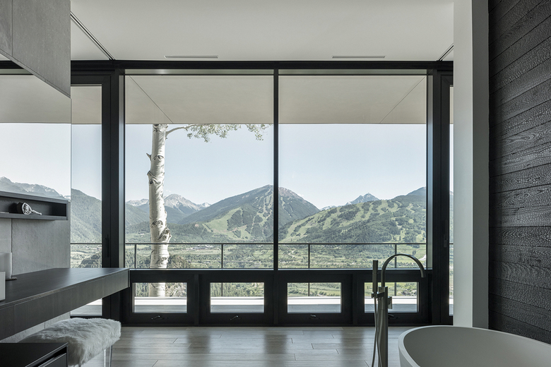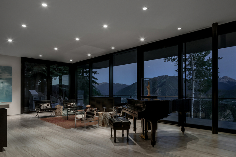 Nature dominates this site, where the house nestles into the ridge line framing the incredible views that vary dramatically as the seasons change. A wrapping view-deck is accessed from every room and spills onto the landscaped terrace that has outdoor dining, fire pit, spa pool, and gardens that collectively focus on views of Aspen, Aspen Mountain, and Independence Pass.