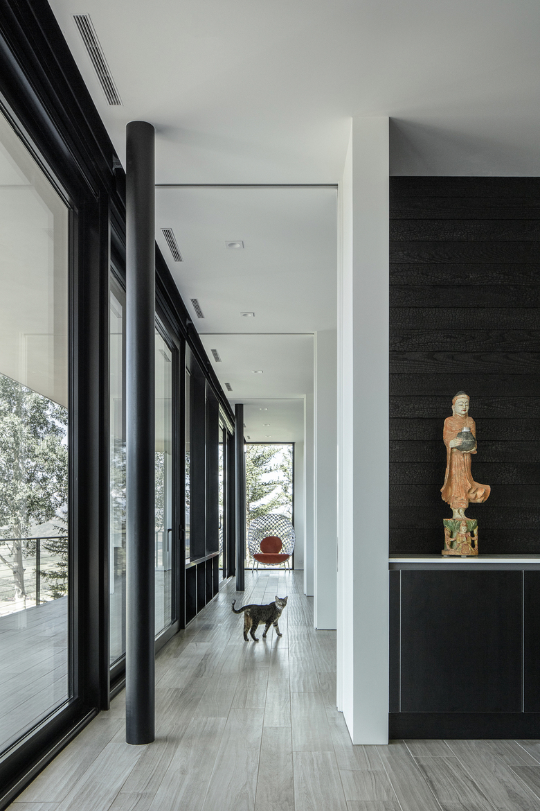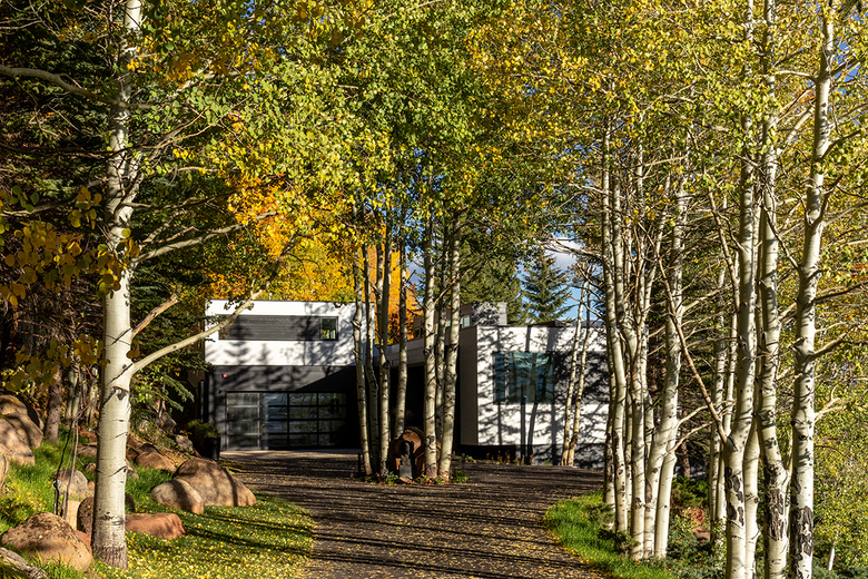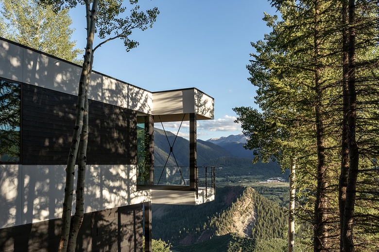 The original structure from 1972 was demolished; we were able to save components of the existing foundation to save on excavation costs and maintain the stability of the hillside. The spectacular site offered an opportunity for the design team to capture views of Elk Mountain Range and the ski areas of Aspen, with the house acting as a "viewfinder" framing these views from every room of the house. The project required 18 months to complete (approval took 8 months due to the visibility of the project in the view plane). The client lived in Asia for several years, hence her curated art collection highlights the interiors.