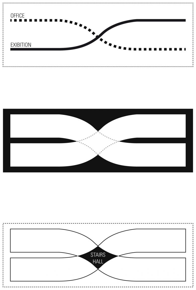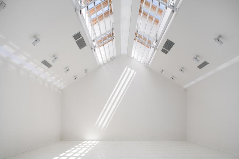 Conceptually the architects arranged the different functions on the ground and first floors around an x-shaped plan. The entrance space and the opposite space on the first floor are used for exhibitions. The other two parts contain the office spaces. The centre of the building is occupied by a wide staircase, which connects the two levels of exhibition space, and is used as an auditorium for meetings, lectures or simply to rest. The main exhibition space is lit by regulated natural light from windows along the ridge of the roof. A rather limited number of windows to connect the visitor to the surrounding landscape are integrated into the circulation space. As the entire interior of building, from floor to ceiling, is white, the only animation of the interior surfaces is created when direct sunlight casts stripes of light on the walls or floors.