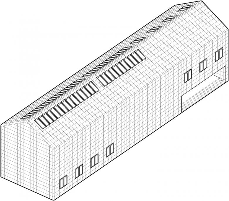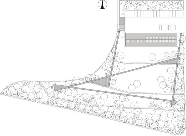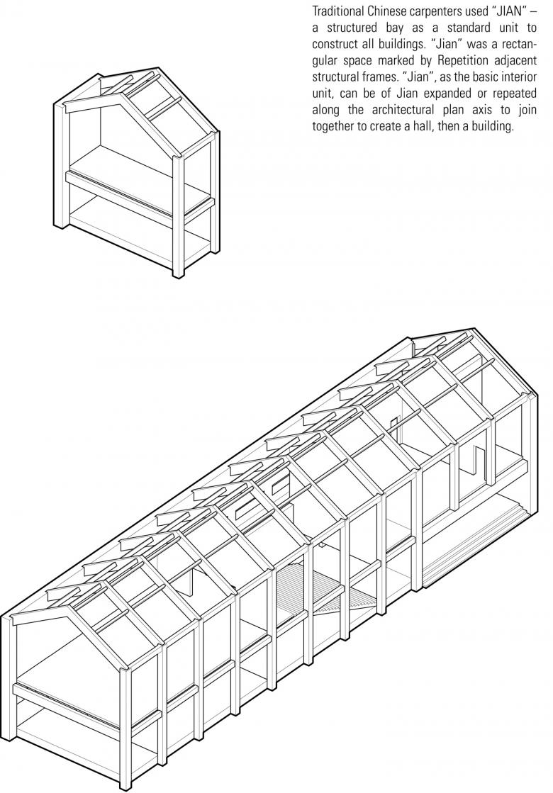 The conceptual design of the museum with a regular shape and a sloped roof, is based on the traditional Chinese architectural unit of »jian« (間). This term describes the space between two columns. In imperial China the number of jian in the timber buildings also reflected the status of the inhabitants: the more jians, the more important the inhabitant. The emperor's buildings were allowed to have nine jian at the most. In the case of the private art museum, called Villa Jian, the client required eleven jian to accommodate such different functions as private and public offices as well as private and public exhibition spaces. Altogether the brief was for a building of about 1,000 square meters, organised by the architects on two levels in a rectangular layout. The building has a strict east-west orientation on an irregularly shaped plot of land. The car parking is located to the north and a garden is planned for the southern part of the site.