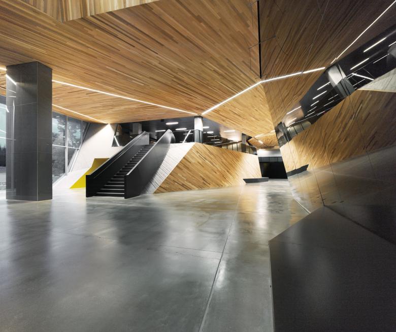 The building doesn’t resemble the forms of trees; it acts like them, at least in theory. (The western facade’s canted concrete bank suggests the sloping base of a tree trunk, although to local skateboarders it happily suggests a ramp at a skateboard park.) As you enter the building, you step into an expansive and dramatic passage rather than a typical lobby. The intention, says Saucier, was to evoke a stroll through the space between huge trees or rock formations.