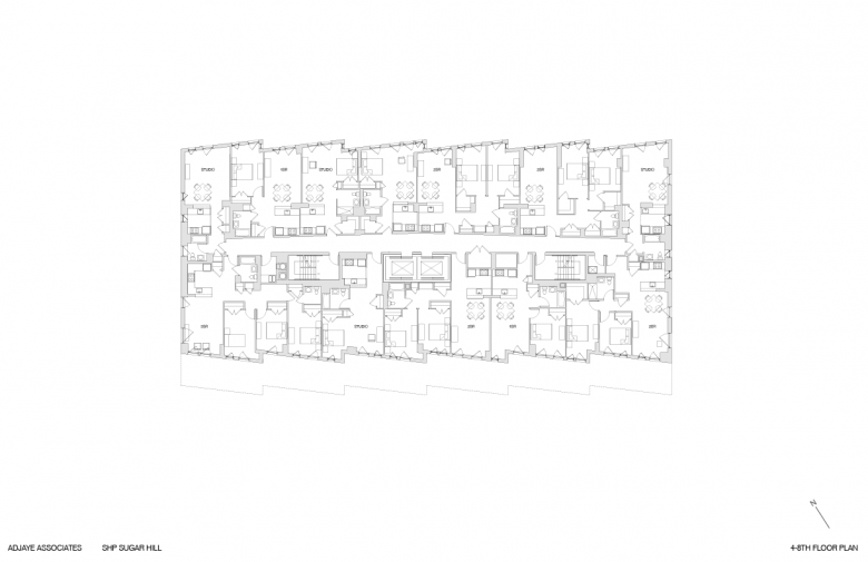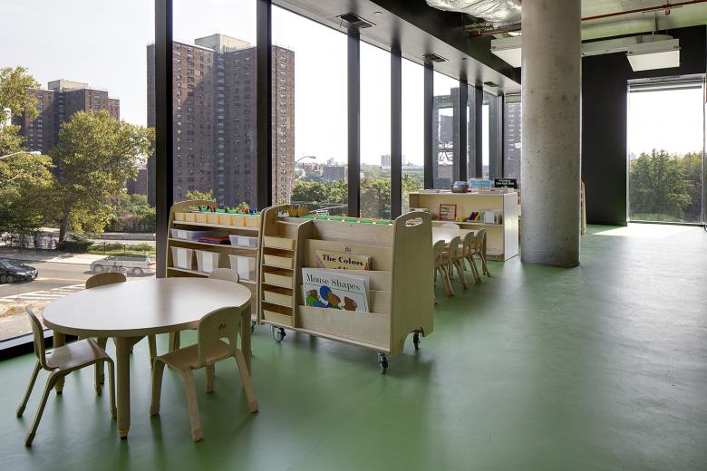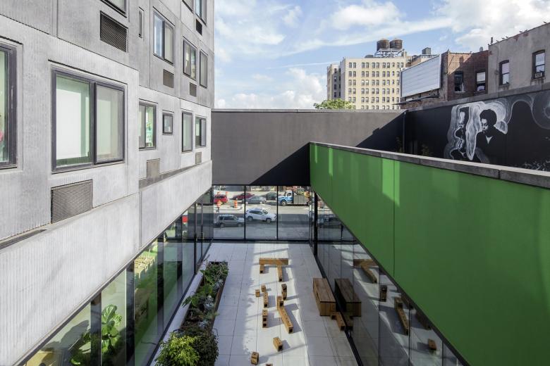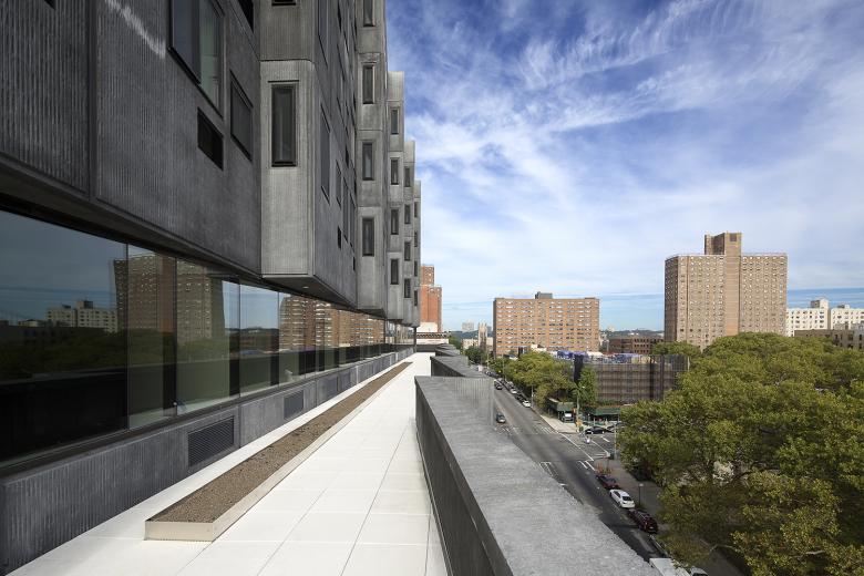 One of the most remarkable aspects of the project is its programmatic diversity. Multi-family residential buildings in New York City—be they affordable, market-rate or a mix of both—tend to be exclusively residential minus some ground-floor retail. The Sugar Hill Development includes public spaces for art, community spaces for children and adults, and office spaces for the developer and other non-profits. These programmatic additions are expressed on the exterior, particularly on the first and ninth floors overlooking the park on the north; from here they are horizontal glass bands within the otherwise gray precast skin.
