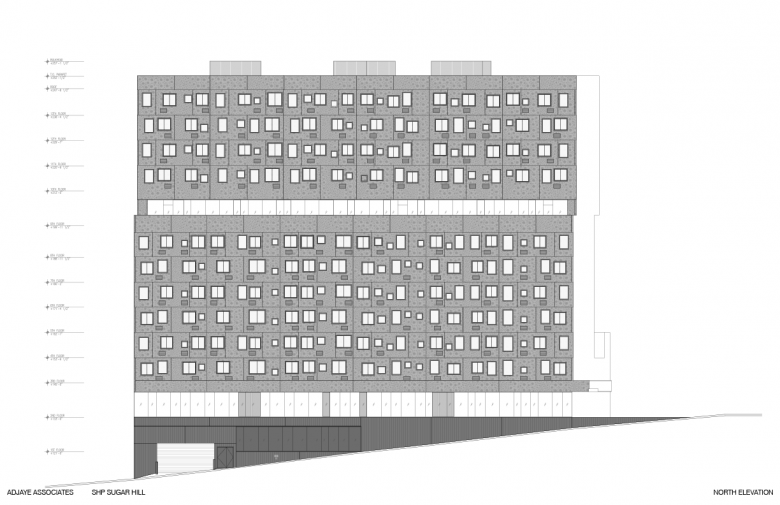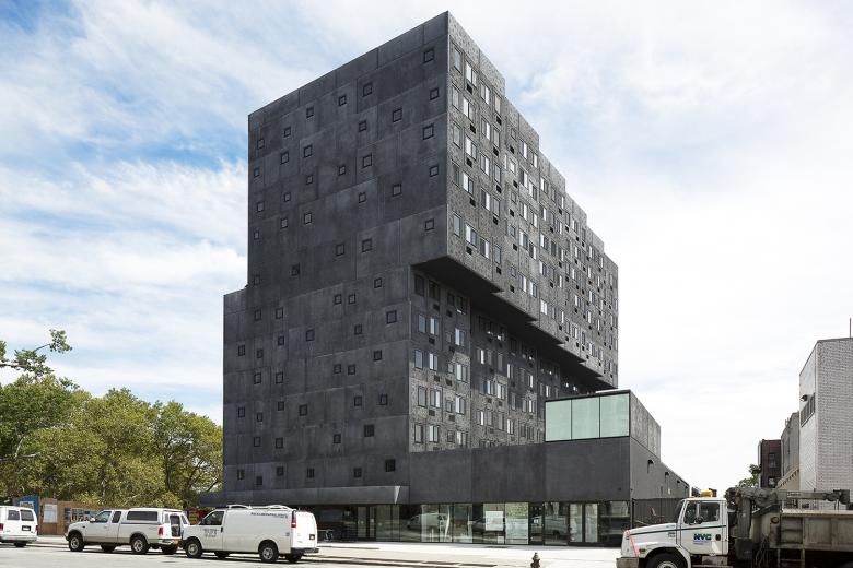 The building's strong presence is accentuated by its dark exterior, which is made up of precast concrete panels. With this choice of material and construction, the window placement is relatively unencumbered, reflected in the random placement of the small windows on the east and west elevations. Further, the serrated north and south facades incorporate the ventilation grilles in a way that is less distracting than most New York City affordable housing projects. A vertical striping permeates the panels, though at certain angles the rose-inspired pattern of circles is evident, what is an artistic touch on a fairly utilitarian wrapper.