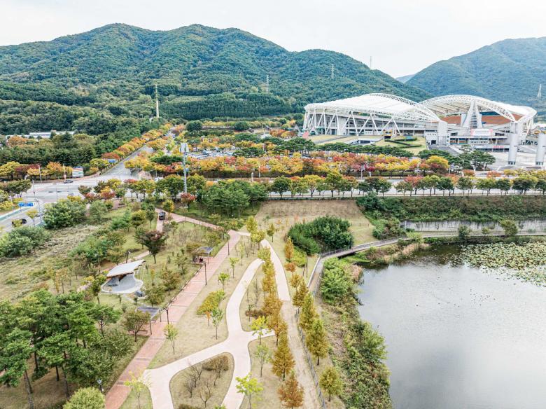 Daejin-ji is a park situated beside a human-made water reservoir, encircled by highways and towering high-rises. As you sit in the park, you can see lotus flowers gently floating on the lake while the hum of passing cars fills the air.