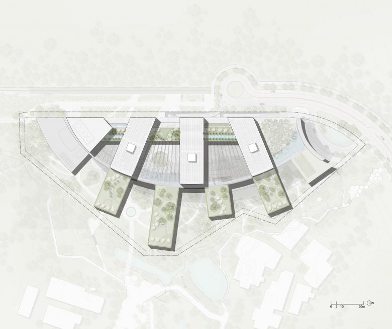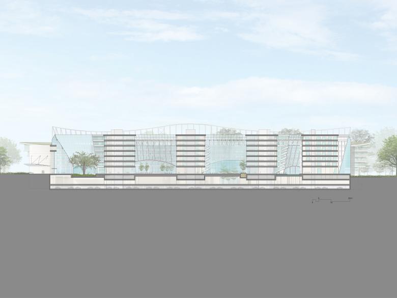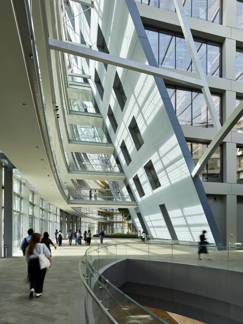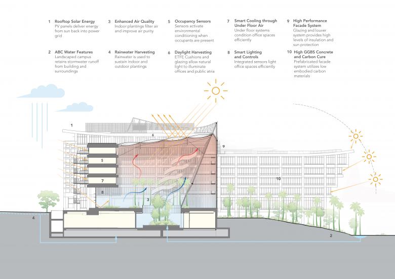• Provides abundant natural light across all floors while minimizing solar heat gain through innovative techniques such as light shelves, louvers, and external screens and a fritted ETFE roof;