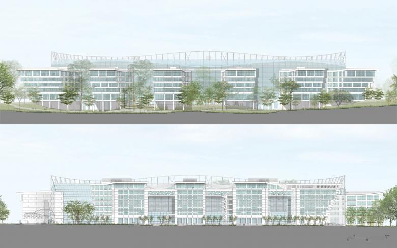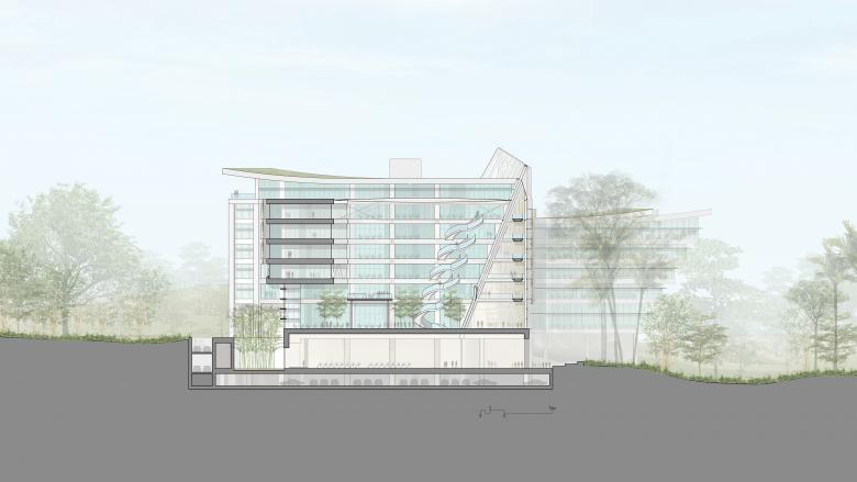 The methodical site strategy preserves more than half of the existing green space. Office blocks cluster along a central pedestrian spine that leads to two spacious lushly planted courtyards. The integration of greenery within the building and on the roof replaces the site’s original vegetation. The stepped and cantilevered facade of the eastern blocks allows existing plants to continue growing underneath and around these volumes to create a treehouse effect inside the offices. Seven miles of walking and bike paths connect the campus and lead to Jurong Eco-Garden, a 12-acre park and wildlife corridor. The project is WELL Pre-Certified by the International WELL Building Institute.