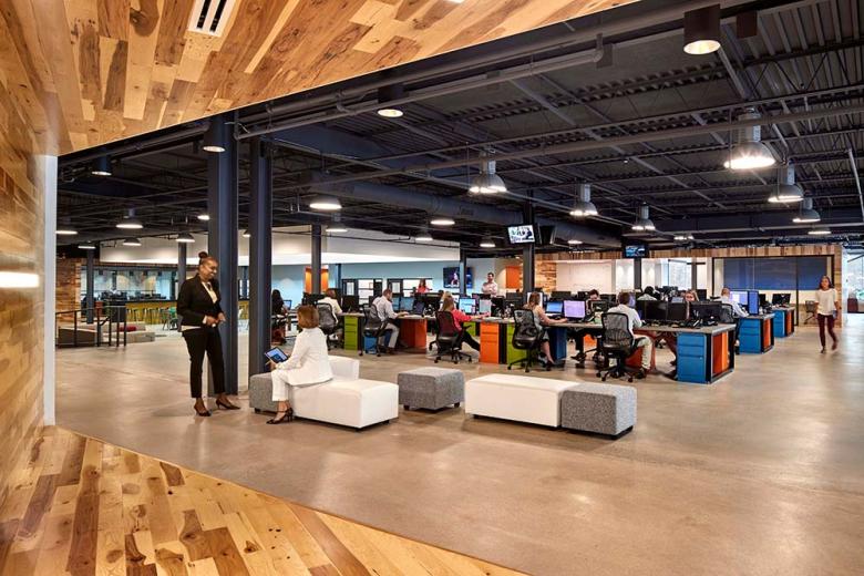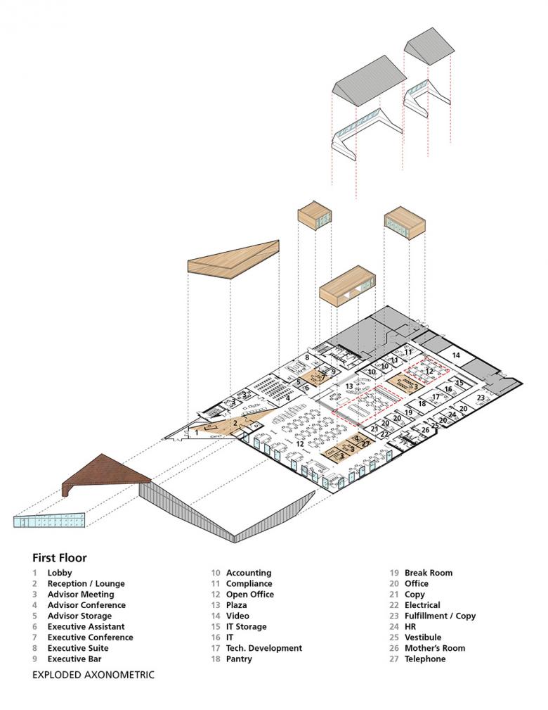 The interior of the project is designed to provide highly collaborative and flexible spaces for staff and visitors. Space is organized around the central skylights and a group of nested “boxes” that contain shared resources such as conference rooms, phone rooms and team spaces. Bench workstations and enclosed offices are arranged around the nested boxes and interstitial lounge spaces for informal meetings. Where data servers formerly sat atop a raised flooring platform, now exists the original sunken floor slab being used to delineate the communal spaces of the new office.