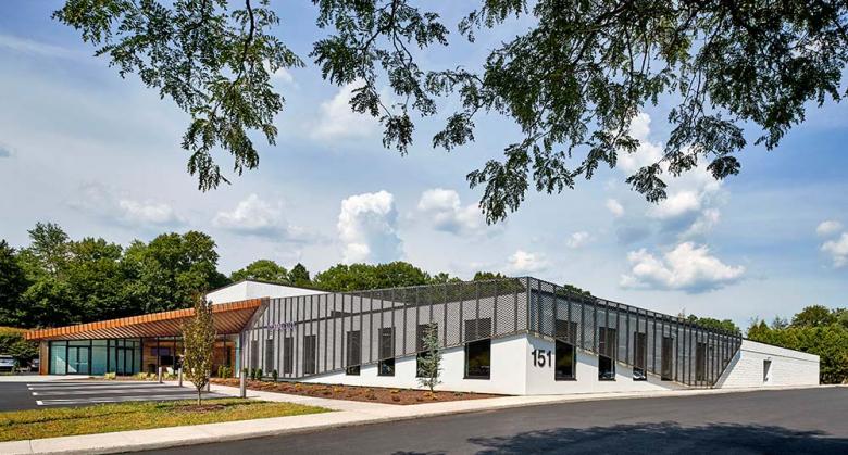 The building was a windowless data center, commonly referred to as “the bunker,” which sat vacant in Glastonbury, Connecticut, for several years. In this contemporary adaptive reuse, we were challenged to bring daylight deep into the 40,000 square-foot building and to stretch the budget with the creative use of raw, industrial materials. To bring light to the interior, new perimeter glazing and large, central skylights were incorporated as critical elements of the renovation.